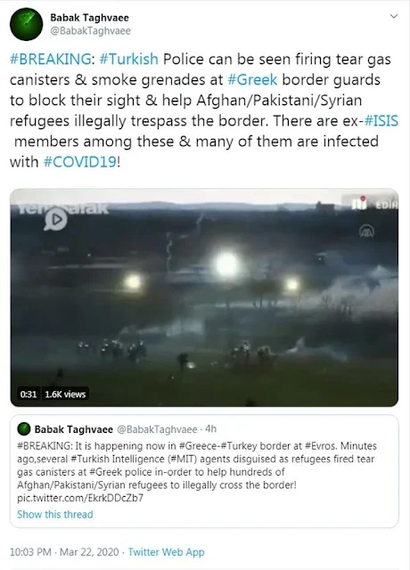 Ο στρατιωτικός συντάκτης Μπαμπάκ Ταγκβαέ, σε δύο αναρτήσεις του την Κυριακή στο Twitter, αναφέρει ότι, τα νέα επεισόδια στον Έβρο προκλήθηκαν από πράκτορες των τουρκικών υπηρεσιών πληροφοριών, της MİT (Εθνική Οργάνωση Πληροφοριών Τουρκίας), που είχαν μεταμφιεστεί σε πρόσφυγες και ήταν οι Τούρκοι πράκτορες που έριχναν τα δακρυγόνα στους Έλληνες αστυνομικούς, για να υποστηρίξουν απόπειρα εκατοντάδων Αφγανών, Πακιστανών και Σύρων να περάσουν παράνομα τα σύνορα.